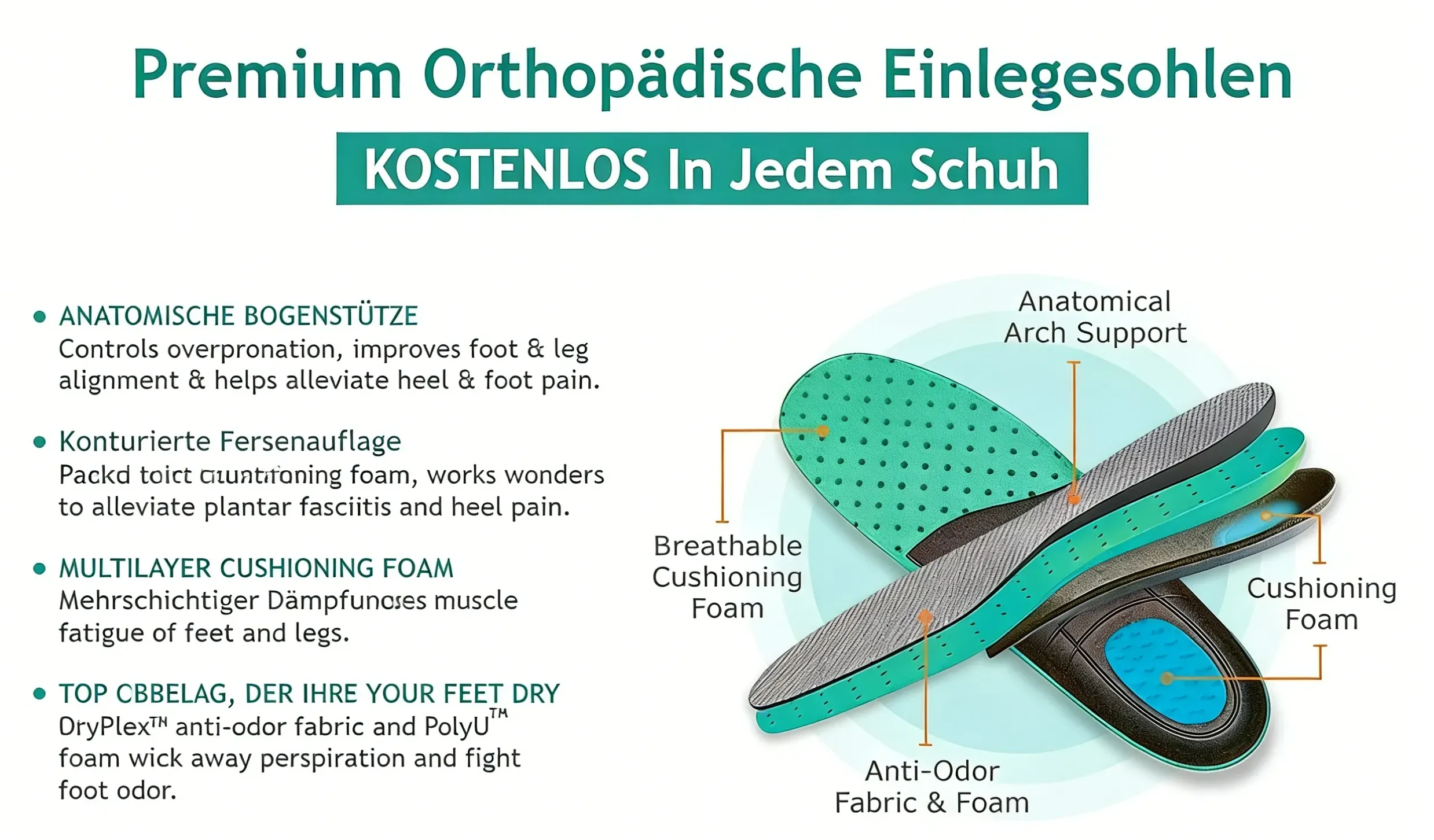 Hochwertige ORTHOPÄDISCHE EINLEGESOHLEN mit verstellbarer Fußgewölbe-Unterstützung und mehreren DÄMPFUNGSSCHICHTEN sorgen für eine weiche, kissenartige Unterstützung.