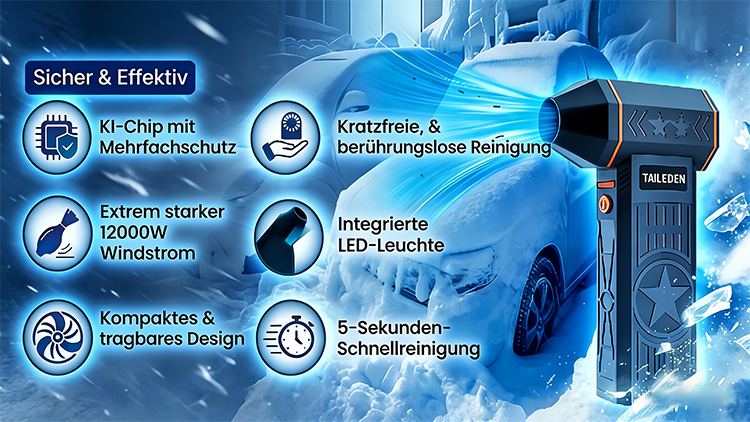 Der TAILEDEN 12000W Schneeräumer, ausgestattet mit einem drehmomentstarken bürstenlosen Motor und einem leistungsstarken Hochtemperatur-Luftstrom, zersetzt Eis sofort und bläst schweren Schnee mühelos weg.
