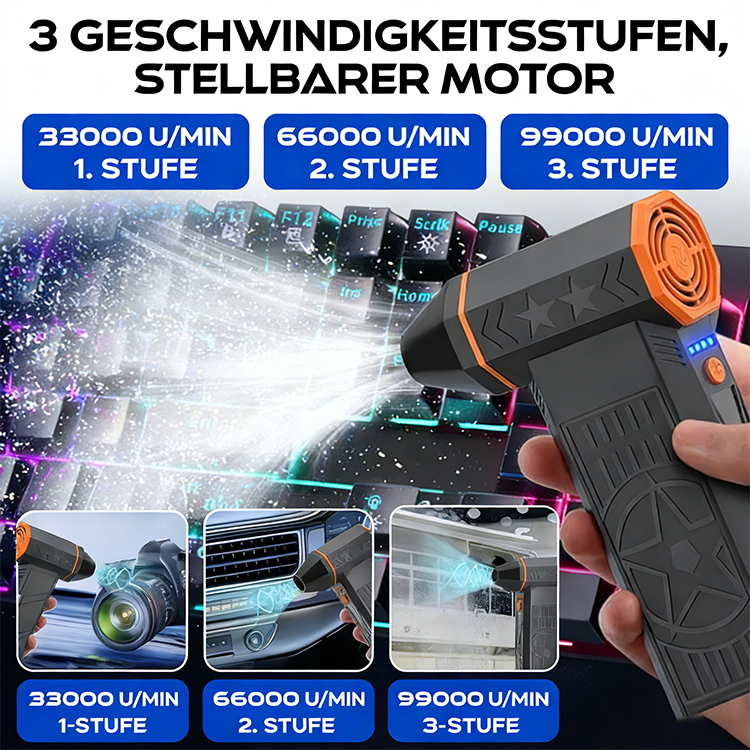 Dieser Motor in Industriequalität erreicht über 100.000 U/min und erzeugt einen Luftstrom, der bis zu achtmal stärker ist als der eines herkömmlichen Haushalts-Haartrockners.
