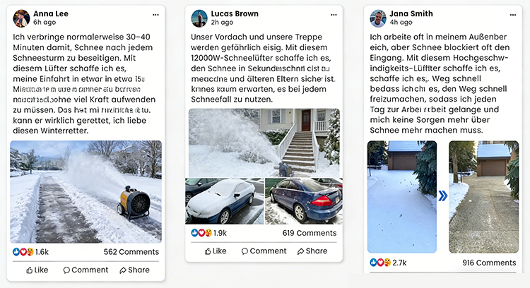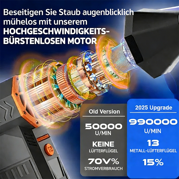 Wie das Herz eines Kraftwerks arbeiten die hohe Drehzahl und das präzise konstruierte Luftkanalsystem perfekt zusammen, um einen extrem starken Heißluftstrom zu erzeugen. Dadurch können Sie Schnee schnell wegblasen und das Schmelzen von Eis deutlich beschleunigen – für eine wirklich schnellere und sauberere Schneeräumung.